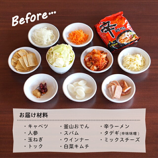 ラーメンやスパムでパンチのある鍋を囲むとみんな笑顔に〜^^ おうちごはんを李朝園ミールセットで楽しみませんか? 原材料 キャベツ、インスタントラーメン、白菜キムチ、ミックスチーズ、韓国おでん、トック、玉ねぎ、ポークランチョンミート、人参、ウインナー、タテギ/調味料(アミノ酸等)、pH調整剤(一部にえび・小麦・乳成分・牛肉・ごま・大豆・豚肉・りんごを含む) 賞味期限 製造日より180日 保存方法 要冷凍(-18℃以下) 配送方法 冷凍便 同梱について 「冷蔵と冷凍」や「常温と冷凍」等、配送方法の違う商品を一緒にご購入いただいた場合には同梱が出来ない為それぞれの梱包に送料がかかってしまいます。