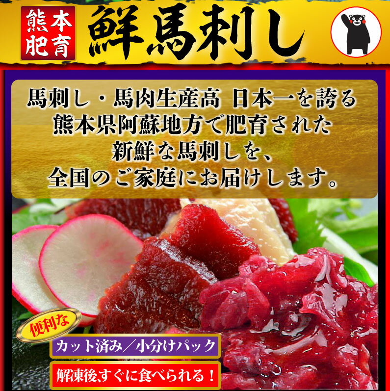 包丁・まな板要らず! 解凍するだけで、新鮮な馬刺しをすぐにお召し上がりいただけます! お酒の肴にはもちろん、高タンパクで低カロリーなので、スタミナUPに、ご家族みんなでお召し上がり 下さい!馬刺し専用の甘口特製たれ付きです。